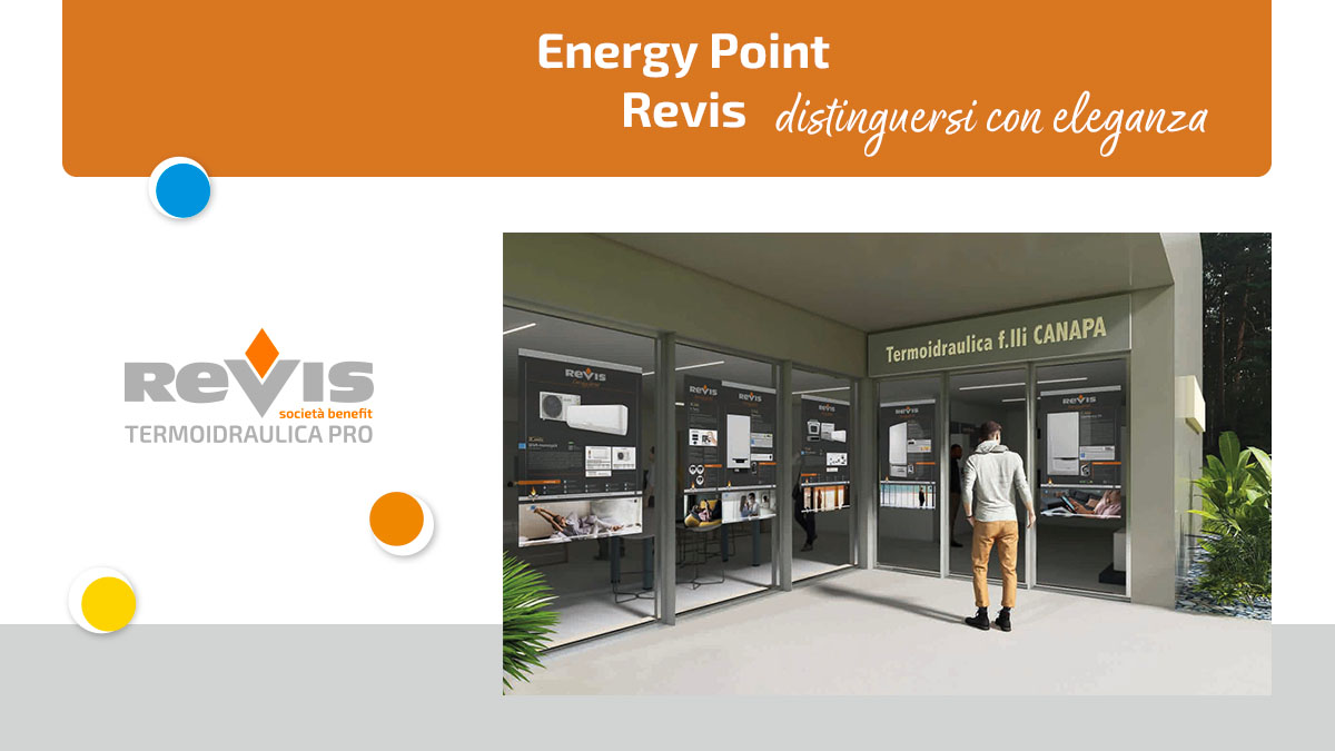 Il riscontro positivo avuto grazie alla nuova sede Revis ha portato la direzione strategica a pensare ad “un’estensione dell’effetto sede” fruibile anche per i negozi degli Specialisti Certificati Revis. In effetti, nella fase di partenza del progetto Energy Point Revis, Revis ha ricreato all’interno della propria sede un’angolo di studio dei possibili spazi commerciali, o corner, dei tecnici specializzati.
