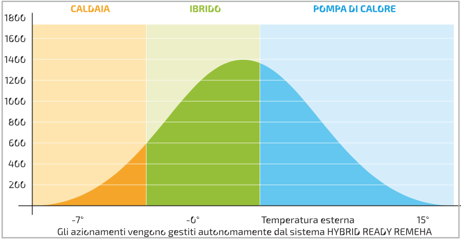 Analogamente, con una temperatura dell’aria superiore al punto di passaggio, la soluzione ibrida vanta prestazioni superiori a quelle di una caldaia a condensazione utilizzata da sola.
